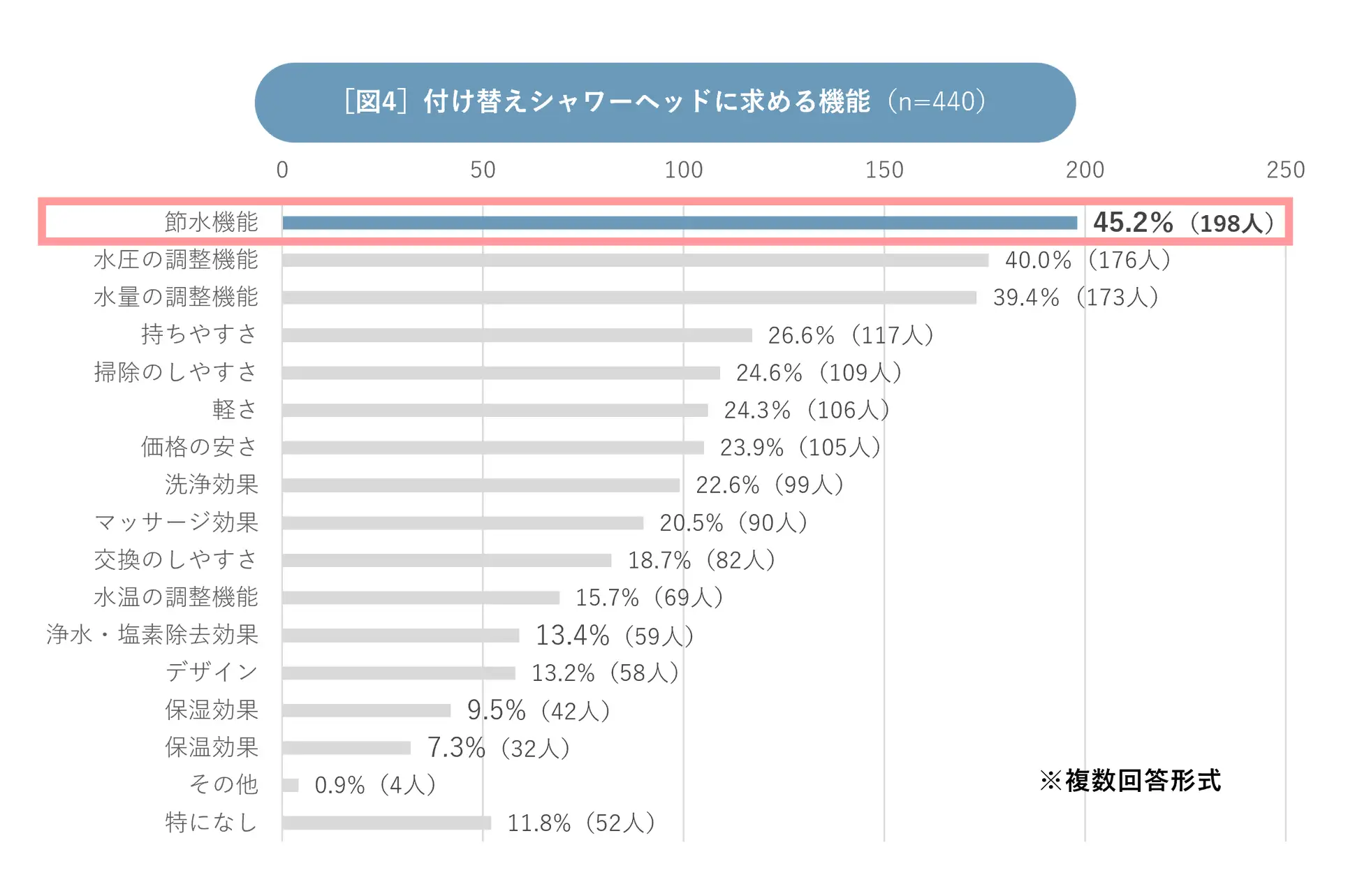付け替えシャワーヘッドに求める機能は「節水機能」であると約5割(45.2%)の人が回答[図4]。
