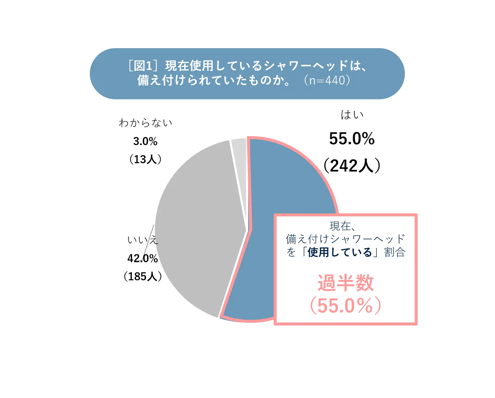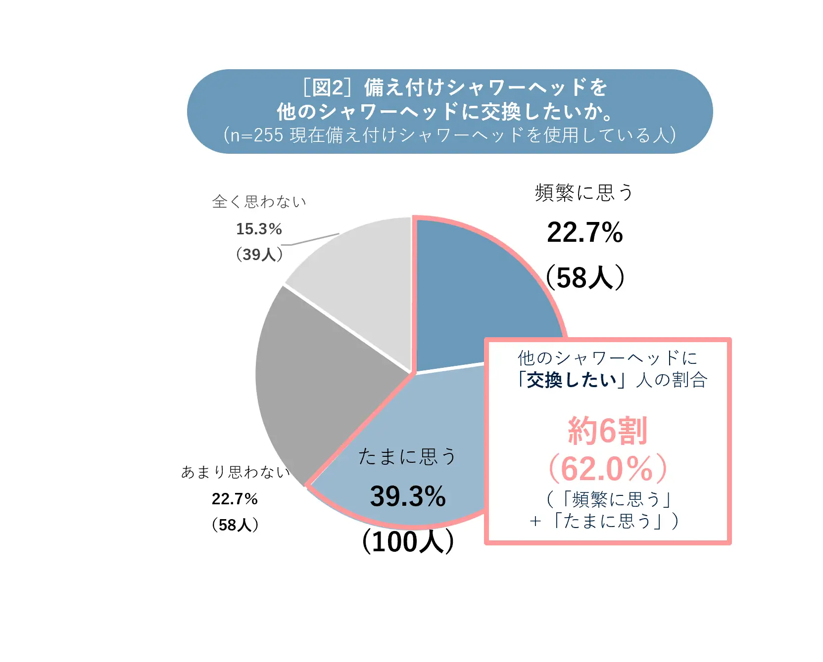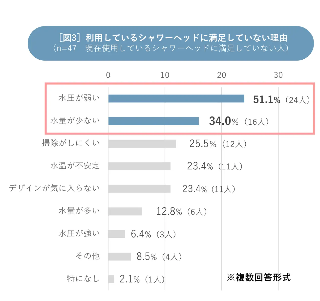 弊社を始め、多くの企業がシャワーヘッドを販売している中で、過半数(55.0%)が備え付けシャワーヘッドを使用し続けていることが分かりました[図1]。一方で、約6割(62.0%)が備え付けシャワーヘッドを他のシャワーヘッドに交換したいと回答[図2]。また、現在使用しているシャワーヘッドに不満を感じている人の具体的な理由としては、「水圧の弱さ」が51.1%、「水量の少なさ」が34.0%となりました[図3]。