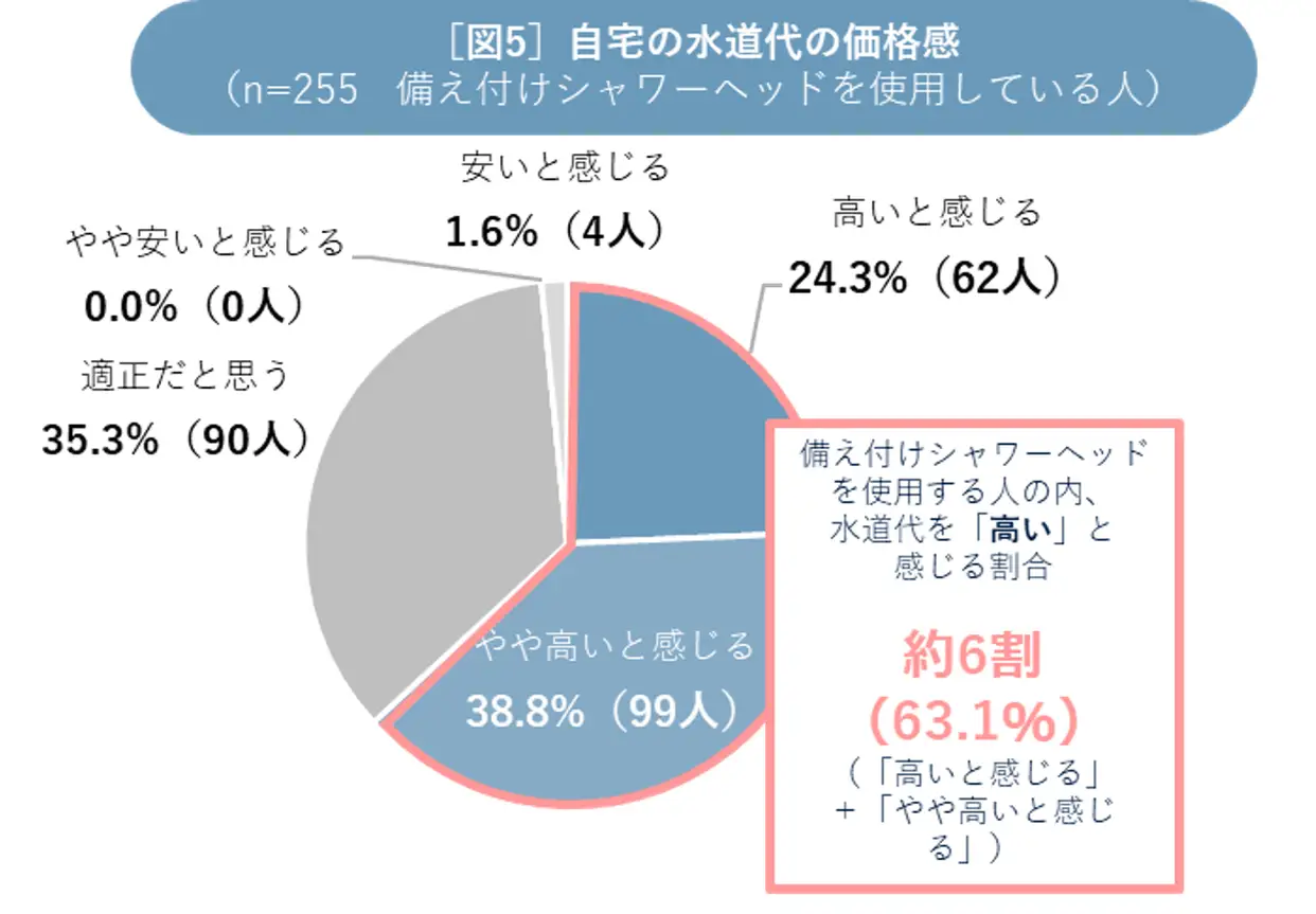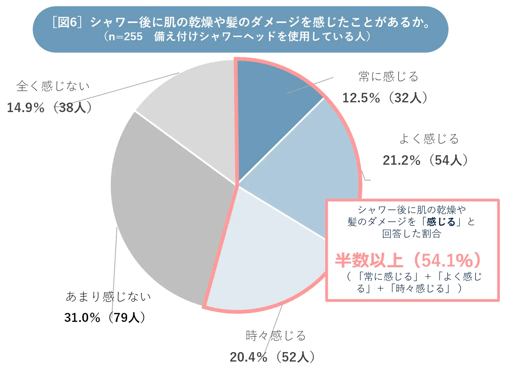 また、備え付けシャワーヘッドを使用している人の内、自宅の水道代を「高い」と感じている人は約6割(63.1%)となり[図5]、物価上昇にも伴い、家計をより気にする傾向にあることが見られました。過半数(54.1%)が、シャワー後に肌の乾燥や髪のダメージを感じたことがあると回答しました。[図6]。